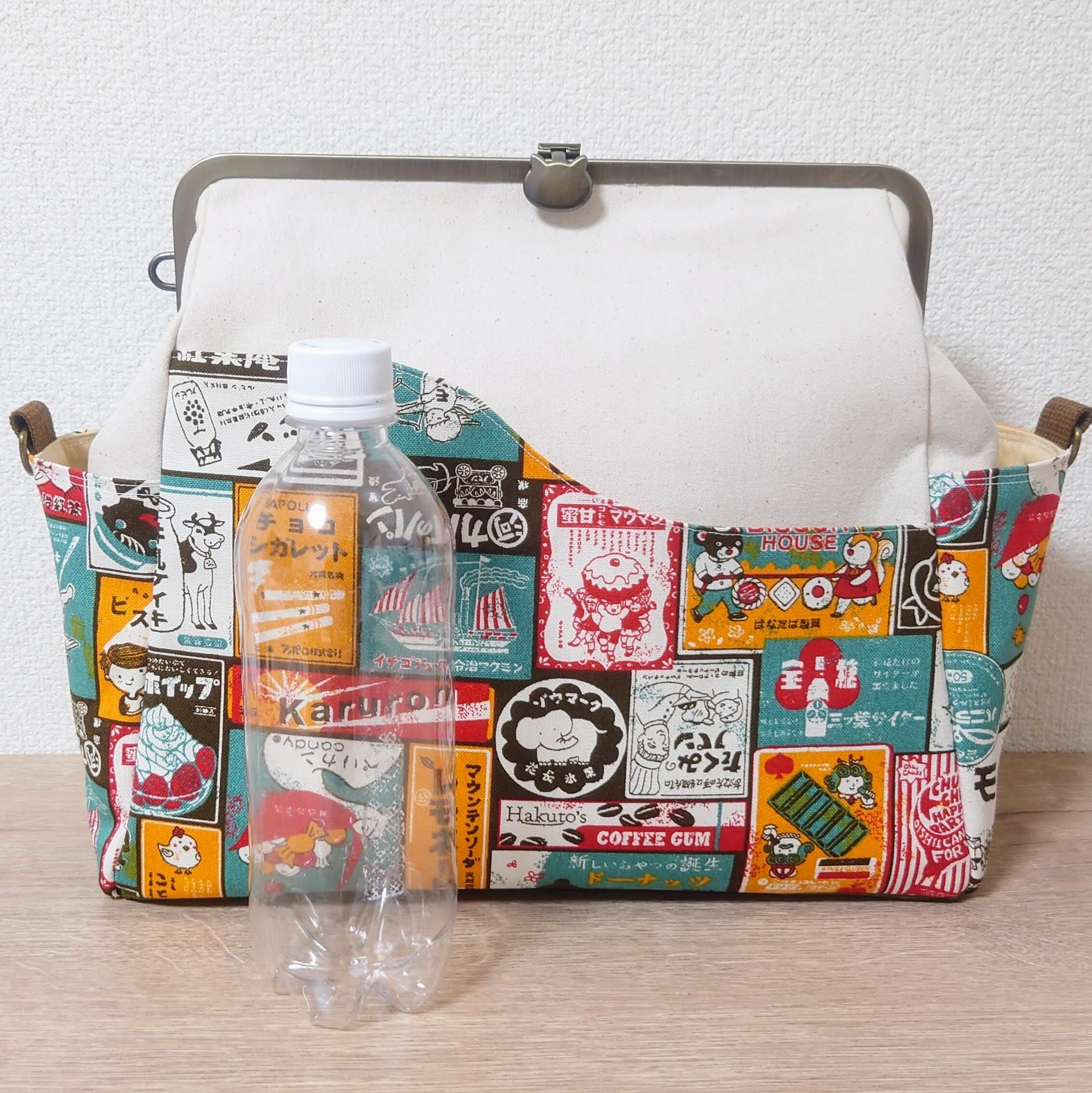 レトロ柄と白の帆布で作ったわりと丈夫ながま口バッグです。